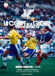 Please register through the Alliance for this limited-seating event : https://www.alliancehouston.org/event-rsvp/la-coupe-de-la-gloire-1998-france-world-cup-official-film/